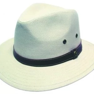Blocked canvas hat by Avenel will keep you covered for all seasons. Stuctured with a medium brim and finished with a faux leather band and metal eyelets.