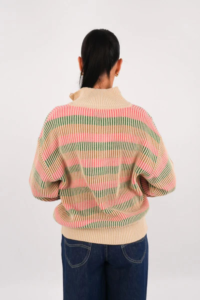 A fresh take on nostalgic stripes, the Estelle Quarter Zip Striped Knit in Cobalt features a relaxed fit with a multi-color ribbed design. A perfect transitional piece for layering with ease.