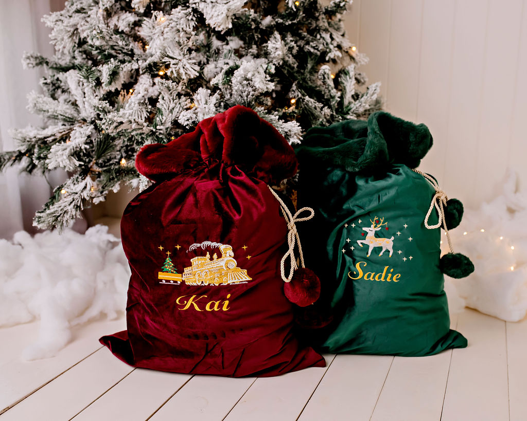 For four years running, and with hundreds of happy customers worldwide, experience the pinnacle of Christmas elegance with our Velvet Santa sacks. Crafted to be the most luxurious you’ll find, each sack features a stunning faux fur top, golden rope, and fluffy baubles in the same colour as the sack. These sacks are designed to become a cherished part of your child’s holiday celebrations for years to come. They come packaged in a reusable storage bag to preserve their beauty and ensure they remain a beloved keepsake.